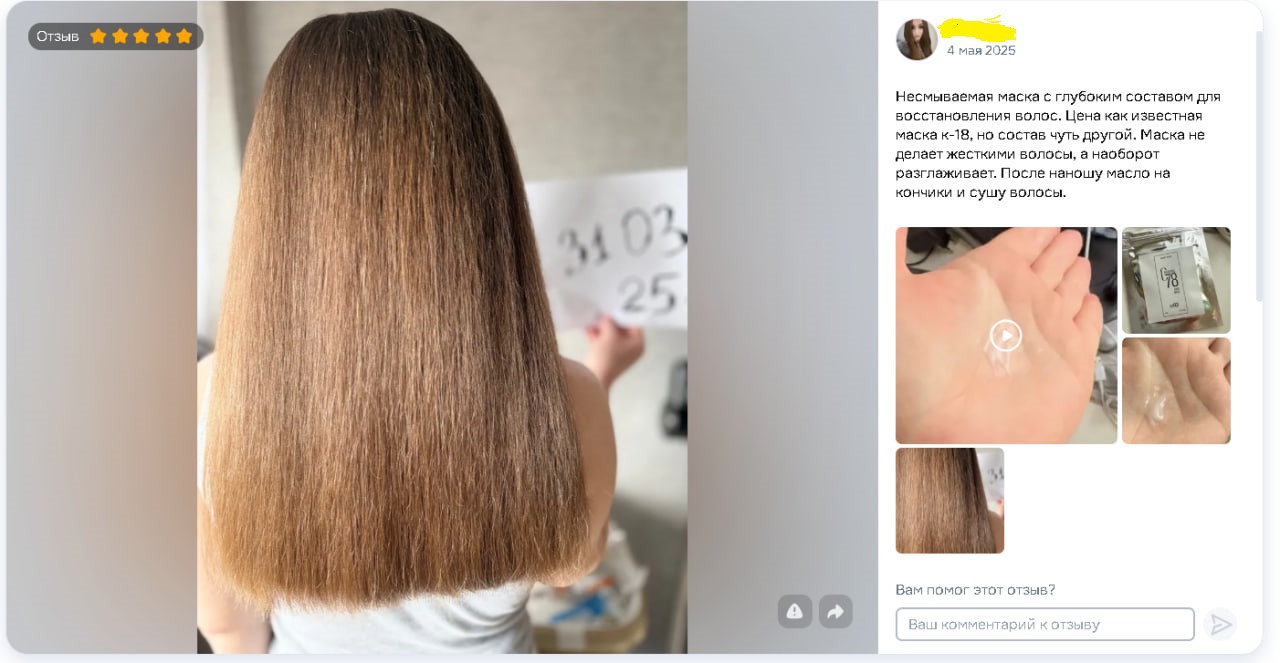 Эффект заметен уже после первого применения и подтверждается визуально и на уровне структуры волос (альтернатива K18/Olaplex без салона)